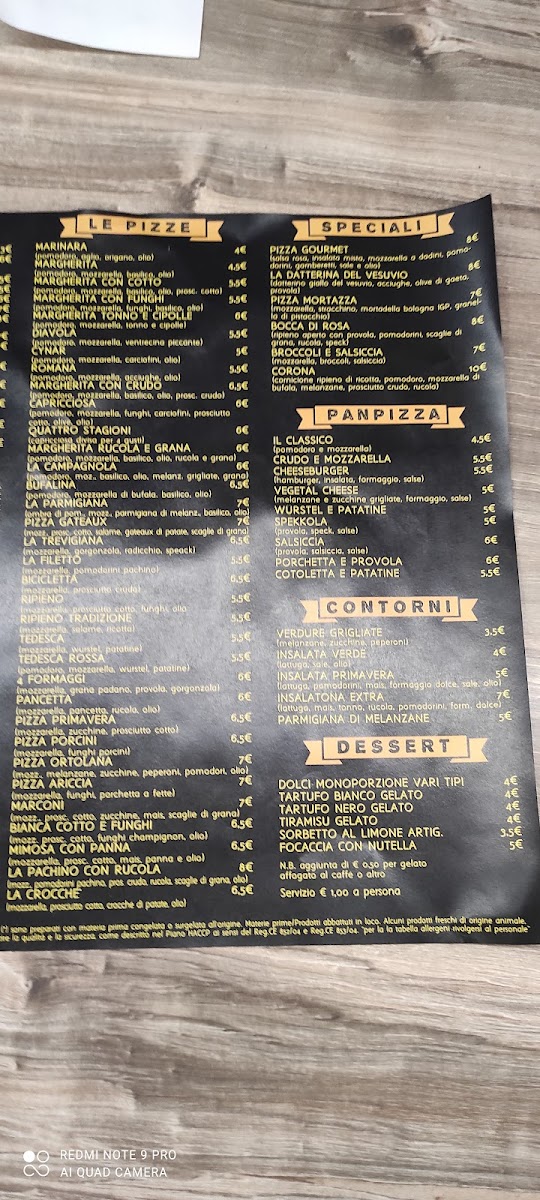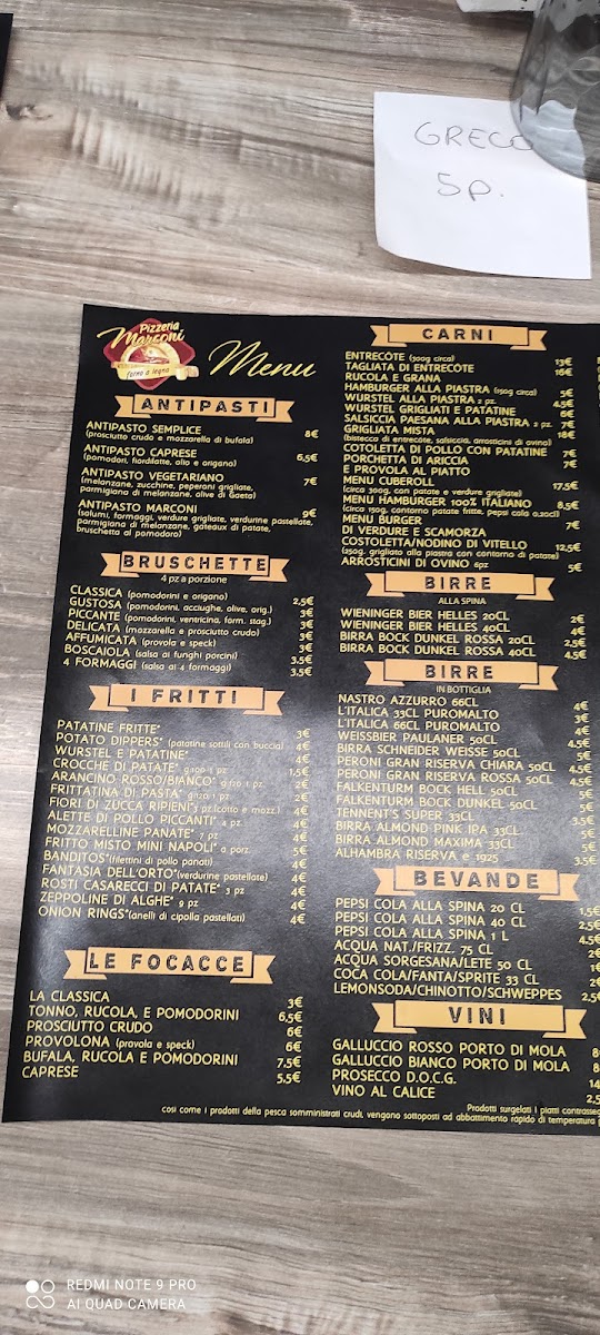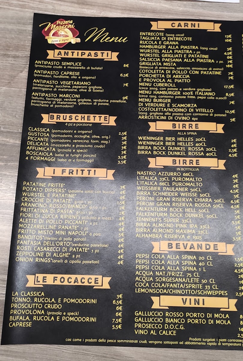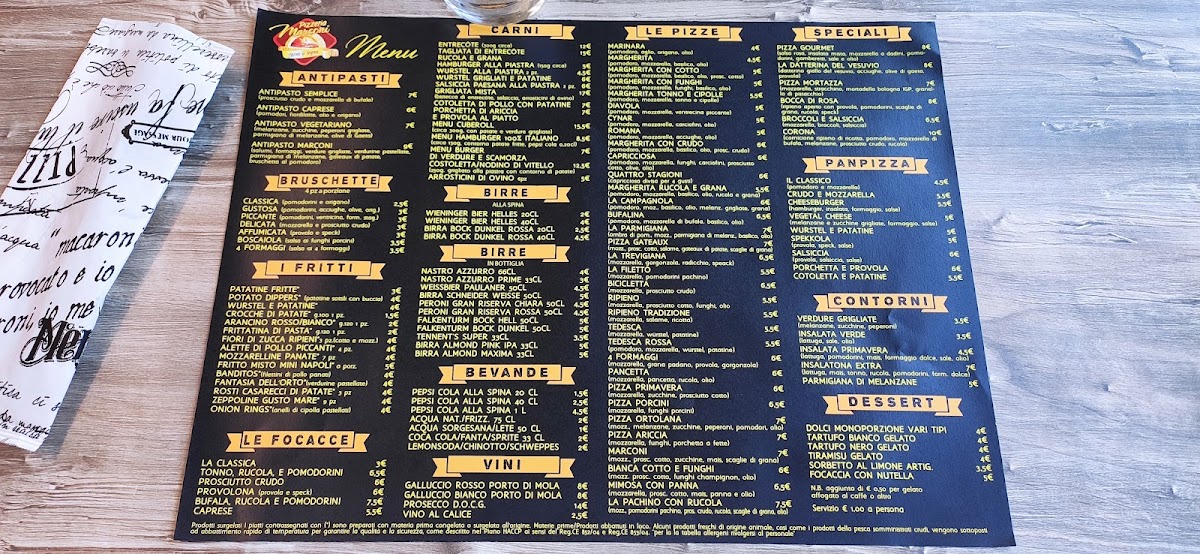 The menu at Pizzeria Marconi presents a well-balanced snapshot of a casual Italian dining experience, where simplicity and variety work together effectively. The selection starts with beverages like Birre and Acqua E Coca-Cola, setting an easygoing tone that matches the informal charm of the restaurant. The pizza offering is clearly the heart of the menu, ranging from classics to more character-driven combinations. Altezza Margherita and Pizza Bufalina highlight a respect for tradition, focusing on quality tomato sauce, mozzarella, and balanced flavors, while Pizza Mortadella E Pistacchio and Pizza - La Mortazza bring a more contemporary touch through the contrast of savory mortadella and aromatic pistachio. Seafood and vegetable lovers are also well served with options such as Pizza Alici Olive Pomodi Gialli and Pizza Con Tonno E Cipolla, both offering clear, recognizable ingredients without unnecessary complexity. The presence of Pan Pizza adds textural variety, appealing to those who prefer a thicker, softer base. Before the main course, starters like Antipasto Marconi, Antipasto Vegetariano, and Bruschette - Mix Con Crema Di Funghi E Speck E Provola provide shareable options that reflect both meat-based and vegetarian preferences, while Patatine Fritte adds a familiar, comforting side. The menu also includes distinctive items such as Bocca Di Rosa, which stands out as a more personality-driven choice within the overall lineup. To close the meal on a sweet note, Torta Cioccolato E Rum offers a straightforward yet indulgent dessert that fits naturally with the rest of the menu. Overall, the selection feels cohesive and thoughtfully composed, focusing on recognizable Italian flavors while still offering enough variation to satisfy different tastes.