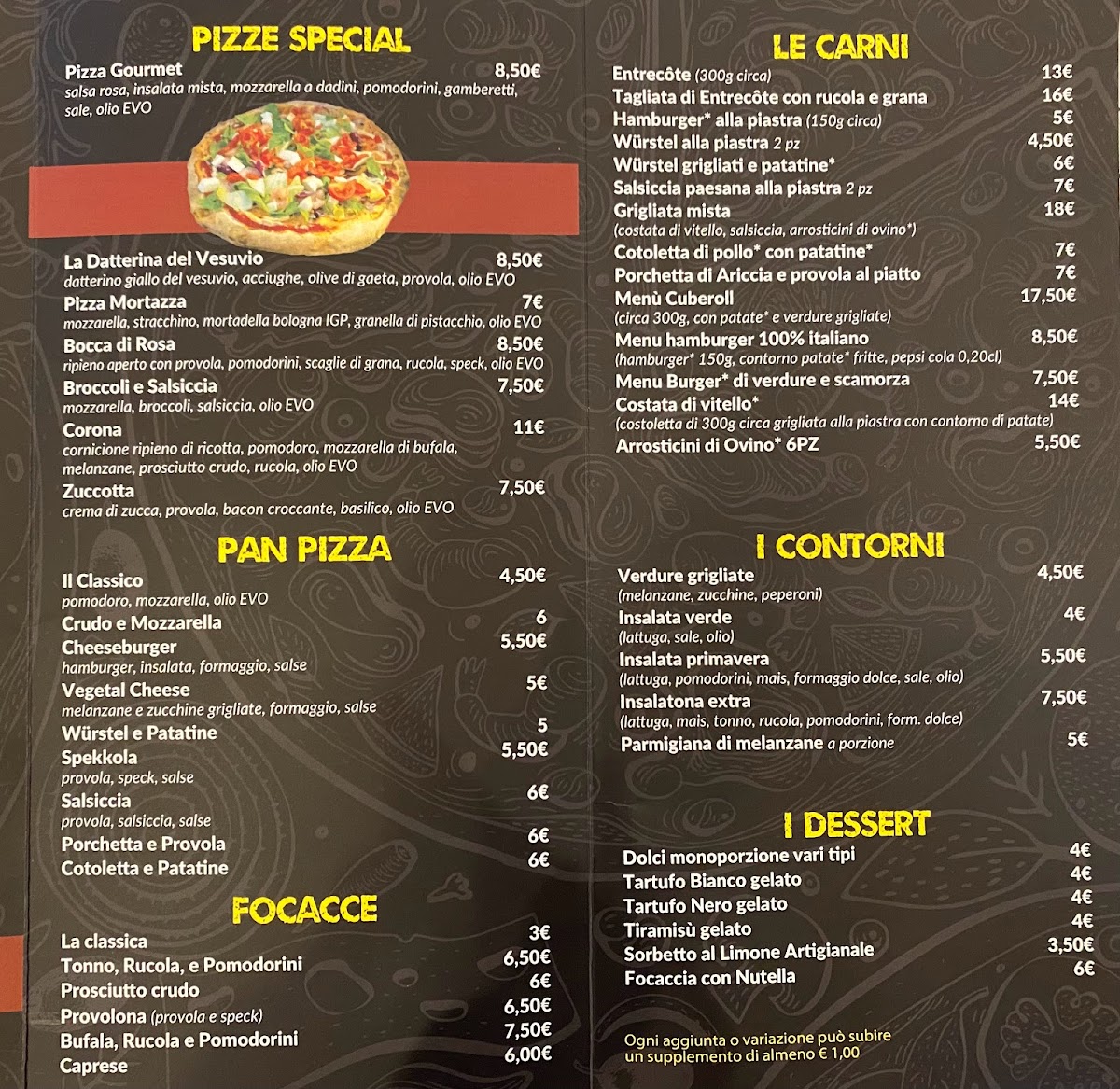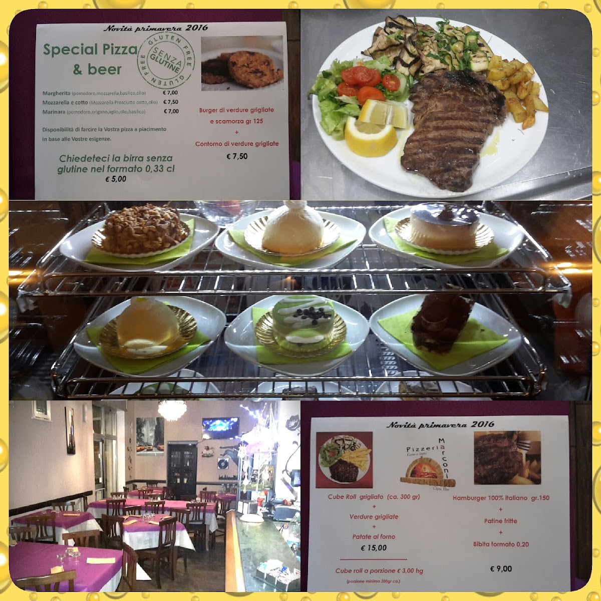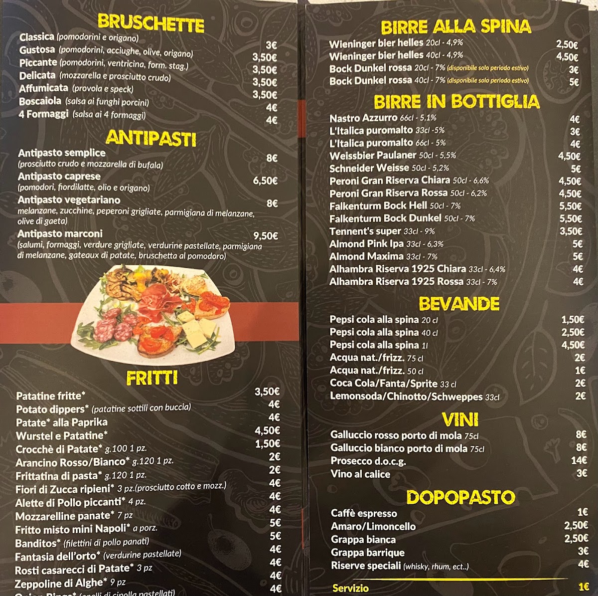 The menu at Pizzeria Marconi presents a well-balanced snapshot of a casual Italian dining experience, where simplicity and variety work together effectively. The selection starts with beverages like Birre and Acqua E Coca-Cola, setting an easygoing tone that matches the informal charm of the restaurant. The pizza offering is clearly the heart of the menu, ranging from classics to more character-driven combinations. Altezza Margherita and Pizza Bufalina highlight a respect for tradition, focusing on quality tomato sauce, mozzarella, and balanced flavors, while Pizza Mortadella E Pistacchio and Pizza - La Mortazza bring a more contemporary touch through the contrast of savory mortadella and aromatic pistachio. Seafood and vegetable lovers are also well served with options such as Pizza Alici Olive Pomodi Gialli and Pizza Con Tonno E Cipolla, both offering clear, recognizable ingredients without unnecessary complexity. The presence of Pan Pizza adds textural variety, appealing to those who prefer a thicker, softer base. Before the main course, starters like Antipasto Marconi, Antipasto Vegetariano, and Bruschette - Mix Con Crema Di Funghi E Speck E Provola provide shareable options that reflect both meat-based and vegetarian preferences, while Patatine Fritte adds a familiar, comforting side. The menu also includes distinctive items such as Bocca Di Rosa, which stands out as a more personality-driven choice within the overall lineup. To close the meal on a sweet note, Torta Cioccolato E Rum offers a straightforward yet indulgent dessert that fits naturally with the rest of the menu. Overall, the selection feels cohesive and thoughtfully composed, focusing on recognizable Italian flavors while still offering enough variation to satisfy different tastes.